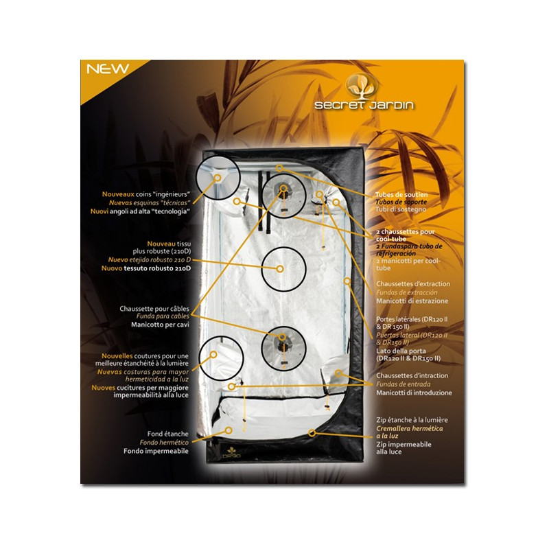 La principale innovation de cette chambre de culture Dark Room DR 60 réside à l'intérieur. En effet, pour optimiser la réflexion, une couche supplémentaire de mylar (type Diamond) a été appliqué sur l'ensemble de ses faces interne !!!
